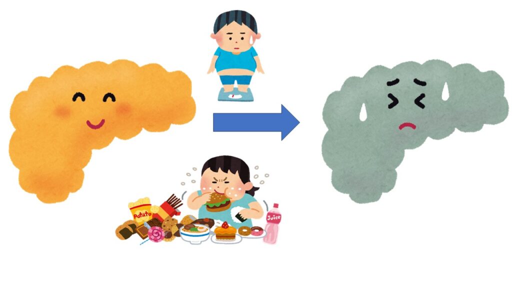 糖尿病は、膵臓から分泌されるインスリンの量や働きが低下して起こります。炭水化物を多く摂り続けると、膵臓が“過重労働”となり疲れてしまいます。特に夕食の炭水化物を控えめにして膵臓の負担を減らしましょう。肥満はインスリンの効きを悪くするため、体重管理も重要です。